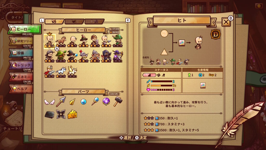 例えば、先ほどの項目でも記載したような「ヒト」と「△」で魔法使いを生産できますが、さらにその上位のヒーローも存在します。